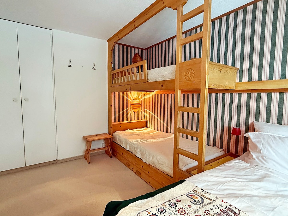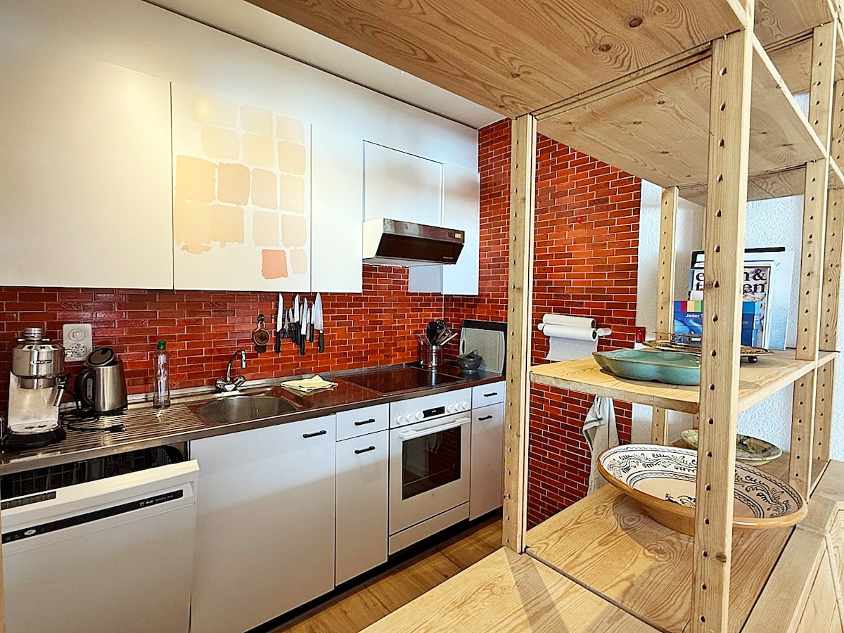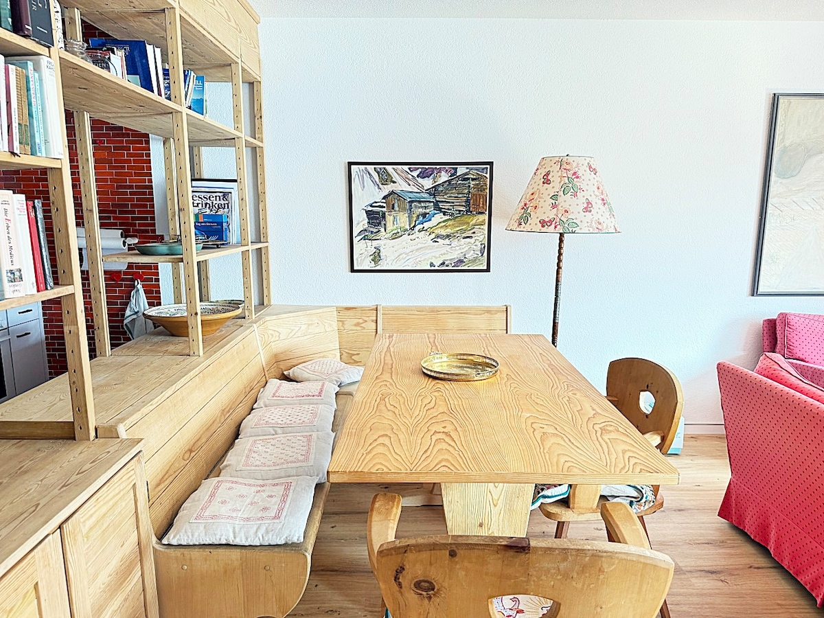 The spaceDie 78 Quadratmeter große Wohnung bietet Platz für bis zu 5 Personen. Sie besticht durch ein modernes Design im alpinen Stil mit Holzakzenten und Originalkunstwerken.