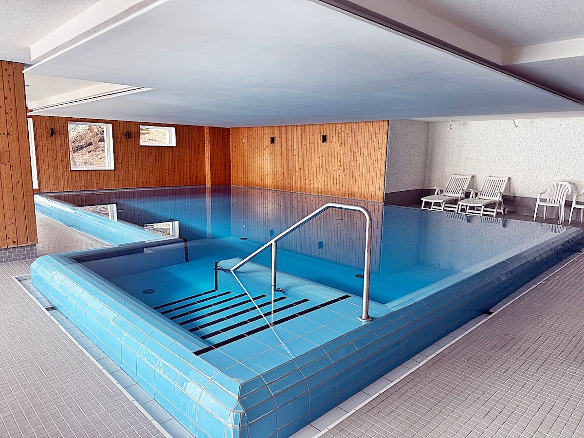 Das Gebäude verfügt über einen großzügigen Innenpool mit angeschlossener Sauna zum Entspannen.